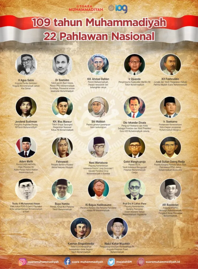 Agar Bung Karno tidak marah (Jasmerah), beberapa waktu lalu pun Amirsyah Tambunan (Sekjen MUI Pusat) telah membuka fakta sejarah dengan menyodorkan paling kurang 21 nama besar warga Muhammadiyah yang telah berkontribusi luar biasa untuk bangsa ini. Saya tulis ulang saja nama-nama itu; KH Ahmad Dahlan (1868-1923), Siti Walidah (1872-1946), Ir. Soekano (1901-1970), Fatmawati (1923-1980), KH. Mas Mansyur (1896-1946), AR Baswedan (1908- 1986), Buya AR Sutan Mansur (1895 – 1985), H. Fakhrudin (1890-1929), H. Abdul Malik Karim Amrullah (Buya Hamka) (1908-1981), Ir. H. Djuanda Kartawijaya (1911-1963), Panglima Besar Jenderal Sudirman (1916-1950), Ki Bagus Hadikusumo (1890-1954), Kasman Singodimejo (1904-1982), Prof. KH. Abdul Kahar Mudzakkir ( 1907-1973), Mr. Teuku H. Moehammad Hasan (1906-1997), Lafran Pane (1923-1991), KIyai Haji Agus Salim, Gatot Mangkupraja (1898-1968), Nani Wartabone (1907-1986), Dokter Soetomo, R. Otto Iskandar Dinata, dan pasti masih banyak yang lainnya.