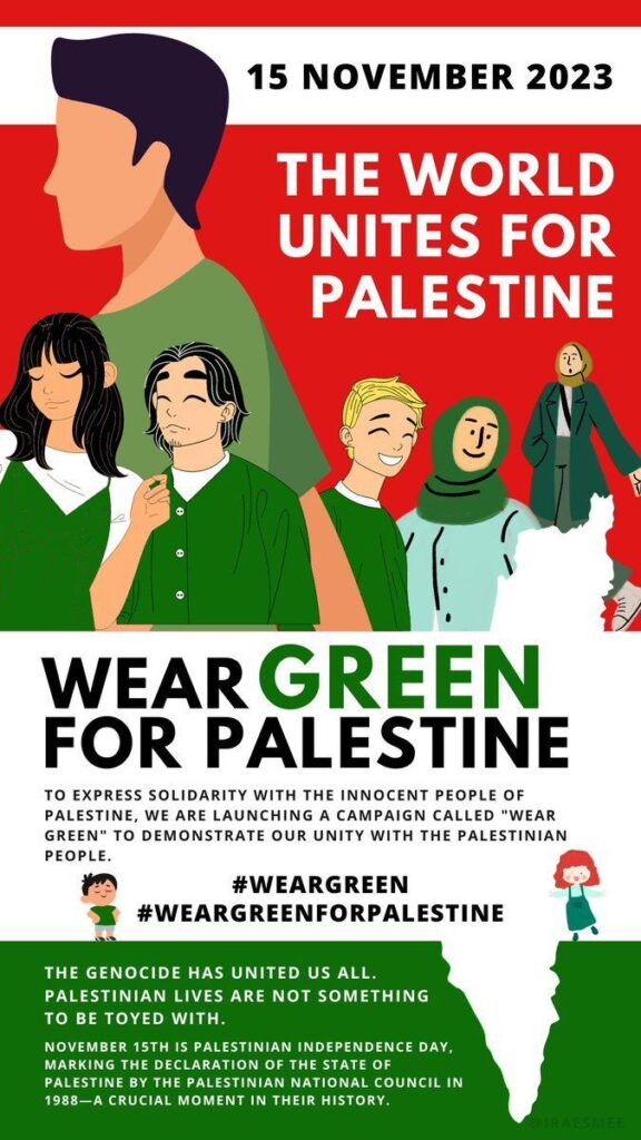 Malaysia, mu4.co.id – Hari ini, tepatnya pada tanggal 15 November 2023 ramai di media sosial menyuarakan seruan gerakan untuk membela Palestina dengan mengenakan pakaian berwarna hijau.