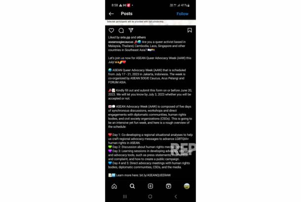 “Apakah kalian aktivis queer yang berbasis di Malaysia, Thailand, Laos, Singapura, dan negara lain di Asia Tenggara? Mari bergabung bersama kami dalam ASEAN Queer Advocacy Week (AAW) Juli ini,” kata ASEAN SOGIE Caucus dalam pengumuman di Instagram @aseansoegicaucus dikutip Republika.co.id di Jakarta, Senin (10/7/2023).