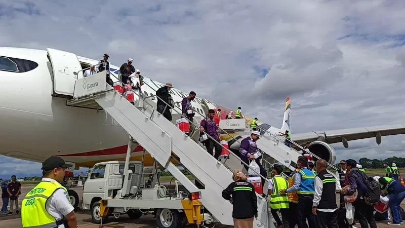 Sebanyak 319 jemaah haji kloter 01 Debarkasi Banjarmasin mendarat di Bandara Syamsudin Noor. [Foto: Radar Banjarmasin]