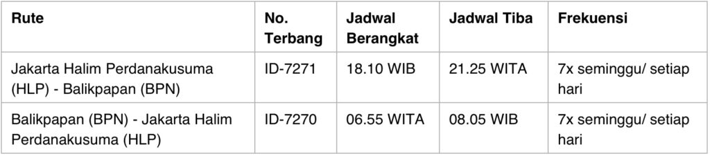Penerbangan Halim Jakarta-Balikpapan oleh Batik Air dimulai pada tanggal 22 Maret 2025. Berikut jadwal penerbangannya: