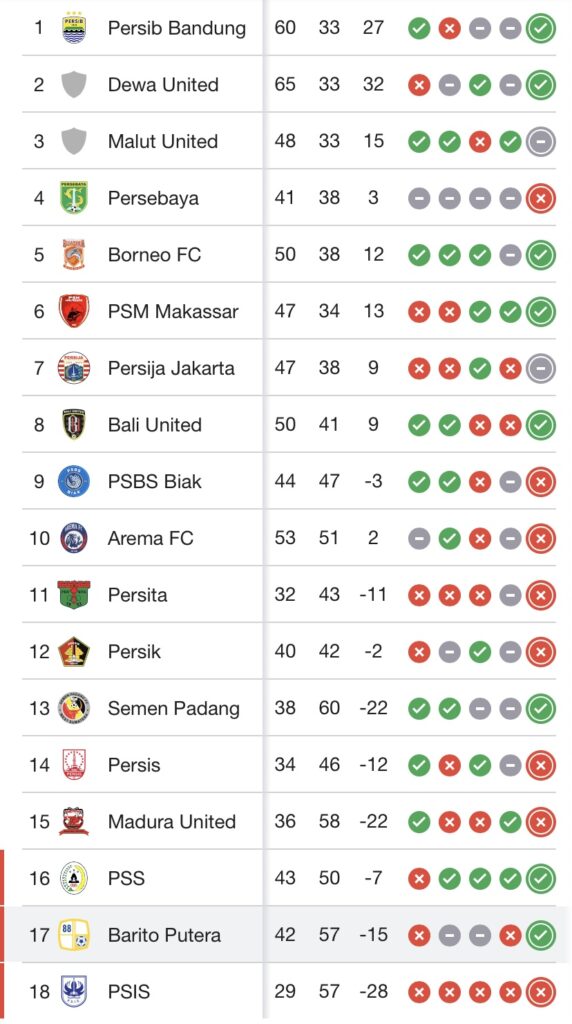 Banjarmasin, mu4.co.id – Liga 1 2024/2025 telah menyelesaikan pekan ke-34 pada Sabtu (24/5) dengan empat pertandingan terakhir. Hasilnya, tiga tim dipastikan terdegradasi yaitu PSIS Semarang, yang sudah lebih dulu dipastikan turun kasta, disusul oleh PSS Sleman dan Barito Putera.