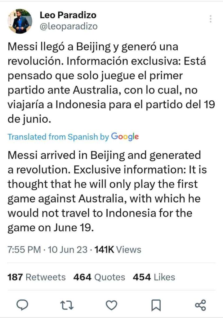 “Messi sudah tiba di Beijing dan menghasilkan revolusi. Informasi eksklusif: Diperkirakan dia hanya akan memainkan pertandingan pertama melawan Australia, jadi dirinya tidak akan melakukan perjalanan ke Indonesia untuk laga kedua pada 19 Juni,” tulis dia di Twitter.