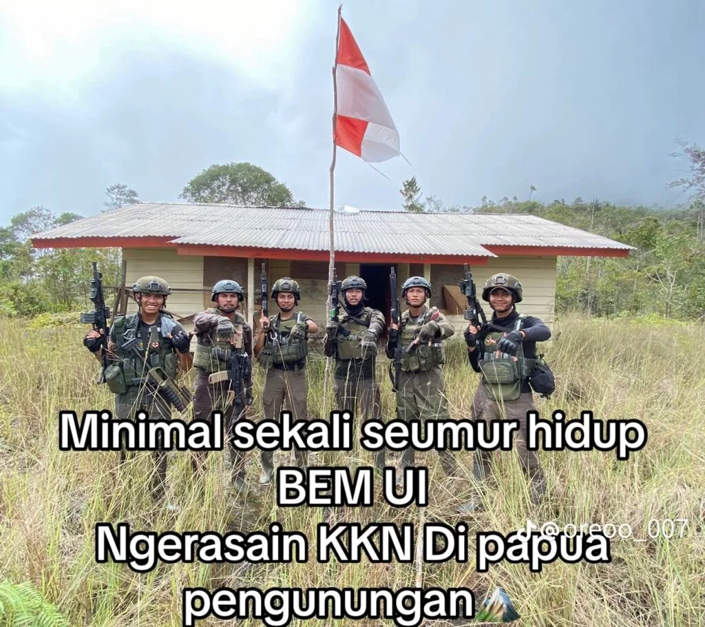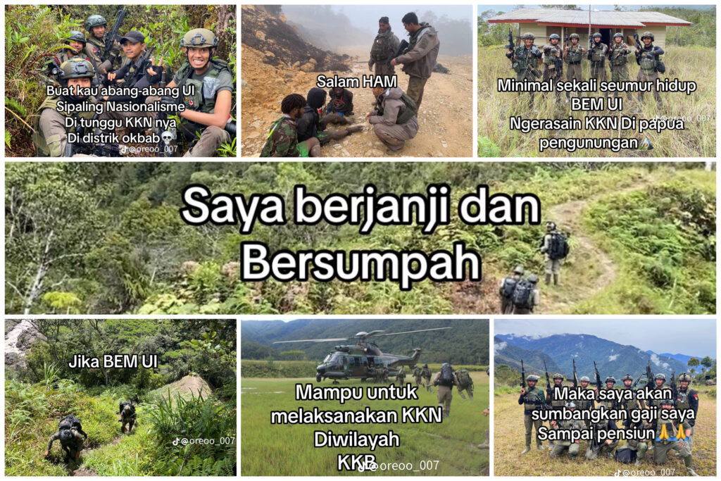 Seorang anggota TNI yang bertugas di Papua menanggapi kritik BEM UI melalui akun TikTok @oreoo_007 dengan menantang mereka untuk melakukan KKN di Distrik Okbab, Papua Pegunungan.