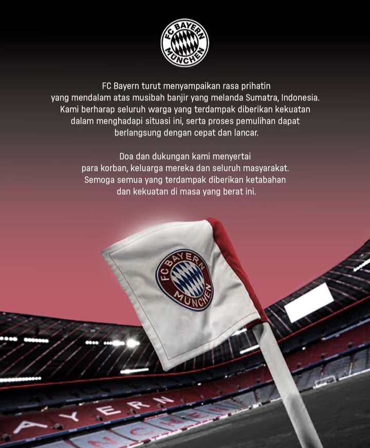 “FC Bayern turut menyampaikan rasa prihatin yang mendalam atas musibah banjir yang melanda Sumatra, Indonesia. Kami berharap seluruh warga yang terdampak diberikan kekuatan dalam menghadapi situasi ini, serta proses pemulihan dapat berlangsung dengan cepat dan lancar,” tambah resmi Bayern Munchen.