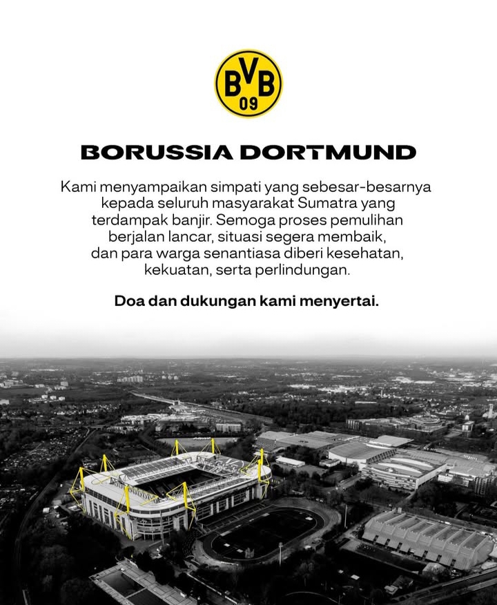 “Tetap kuat Sumatra, kami bersama kalian. Kami menyampaikan simpati sebesar-besarnya kepada seluruh masyarakat Sumatra yang terdampak banjir. Semoga proses pemulihan berjalan lancar, situasi segera membaik dan para warga senantiasa diberi kesehatan kekuatan, serta perlindungan,” kata Borussia Dortmund.