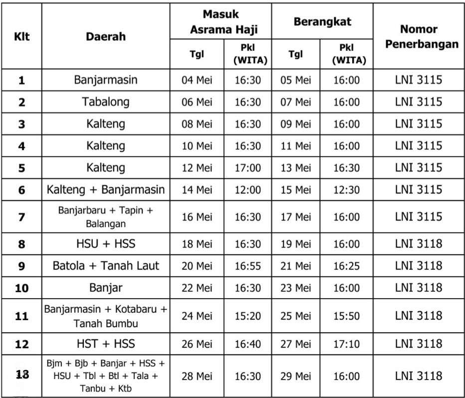 Berikut ini jadwal lengkap keberangkatan jemaah haji Embarkasi Banjarmasin: