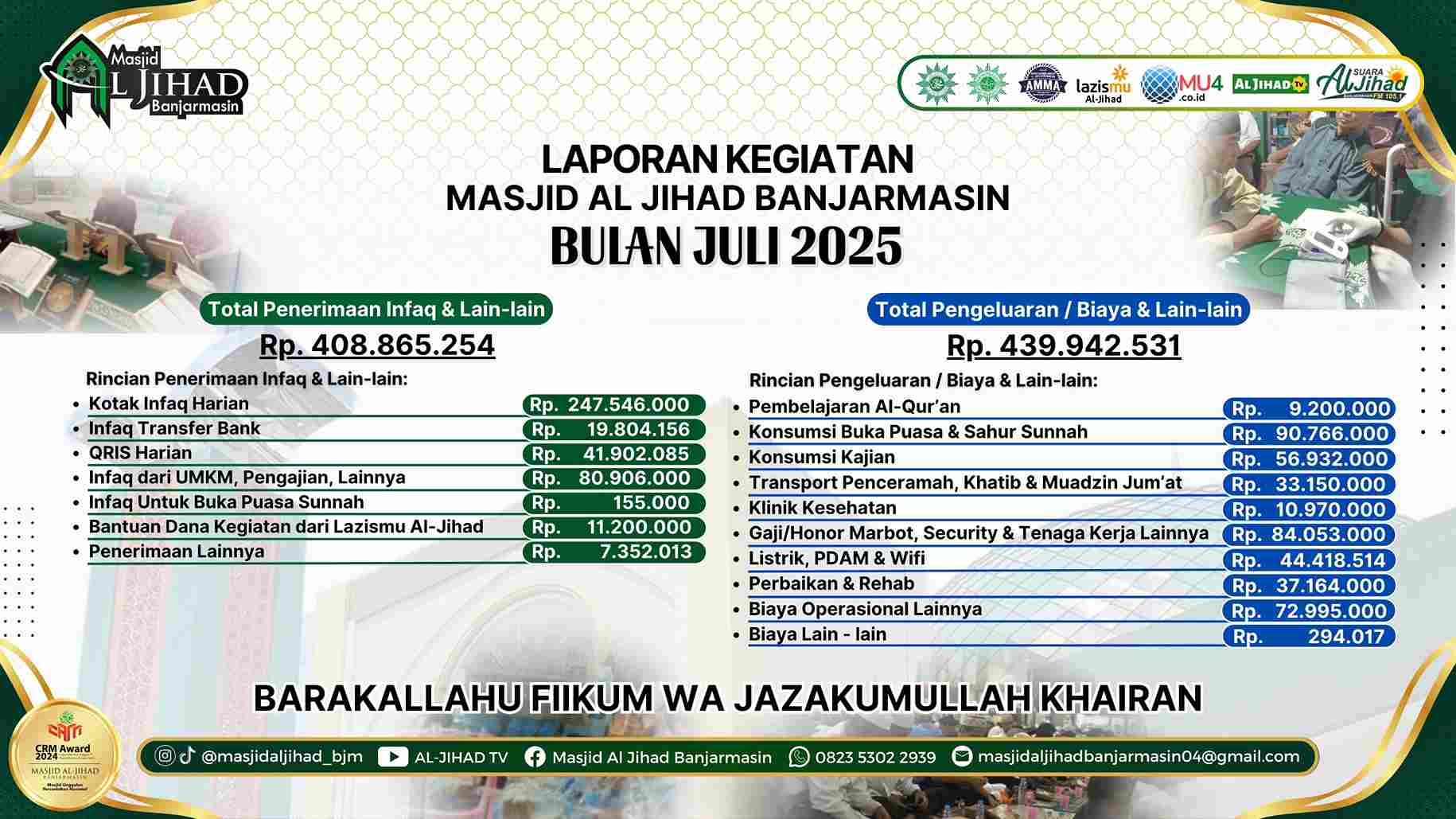 Berikut Ini Laporan Penerimaan dan Pengeluaran Masjid Al Jihad Banjarmasin Bulan Juli 2025!
