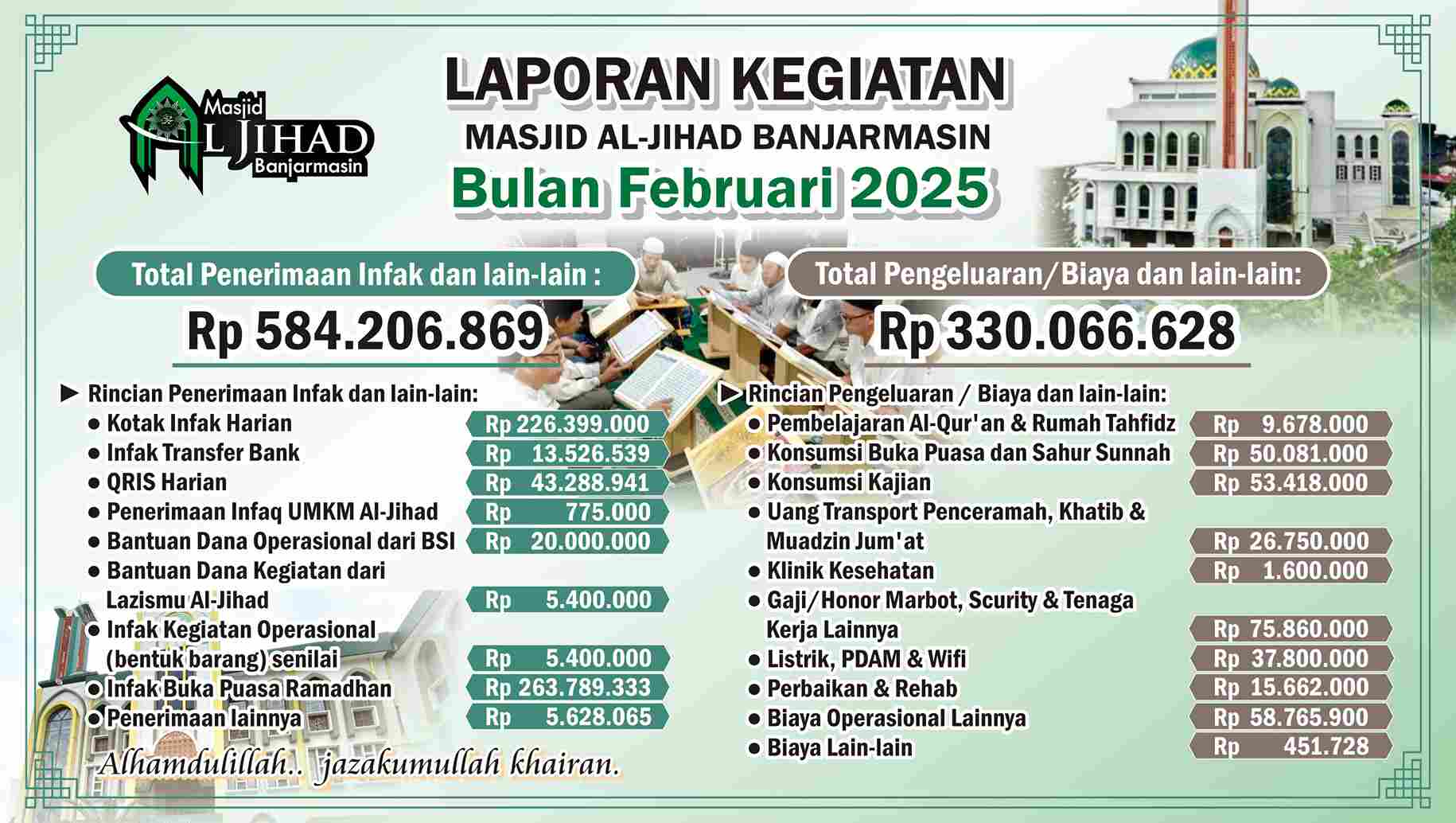 Berdasarkan laporan keuangan yang di-publis oleh Takmir Masjid Al Jihad Banjarmasin pada Senin (10/3/2025) menyebutkan pengeluaran tersebut diantaranya adalah untuk membiayai program pembelajaran Al-Qur’an dan Rumah Tahfidz; konsumsi buka puasa, sahur sunnah; konsumsi kajian; uang transport penceramah, khatib dan muadzin Jum’at; klinik Kesehatan, gaji karyawan; biaya Listrik, PDAM, Wi-fi; perbaikan dan rehab; serta biaya operasional lainnya.