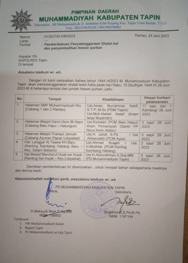 Tapin, mu4.co.id – Berdasarkan surat Pemberitahuan No.013/OT/III.0/B/2023 tentang penyelenggaraan Shalat Idul Adha oleh Pimpinan Daerah Muhammadiyah (PDM) Kabupaten Tapin yang diterima redaksi mu4.co.id menerangkan bahwa shalat Ied dilaksanakan pada Rabu 28 Juni 2023.