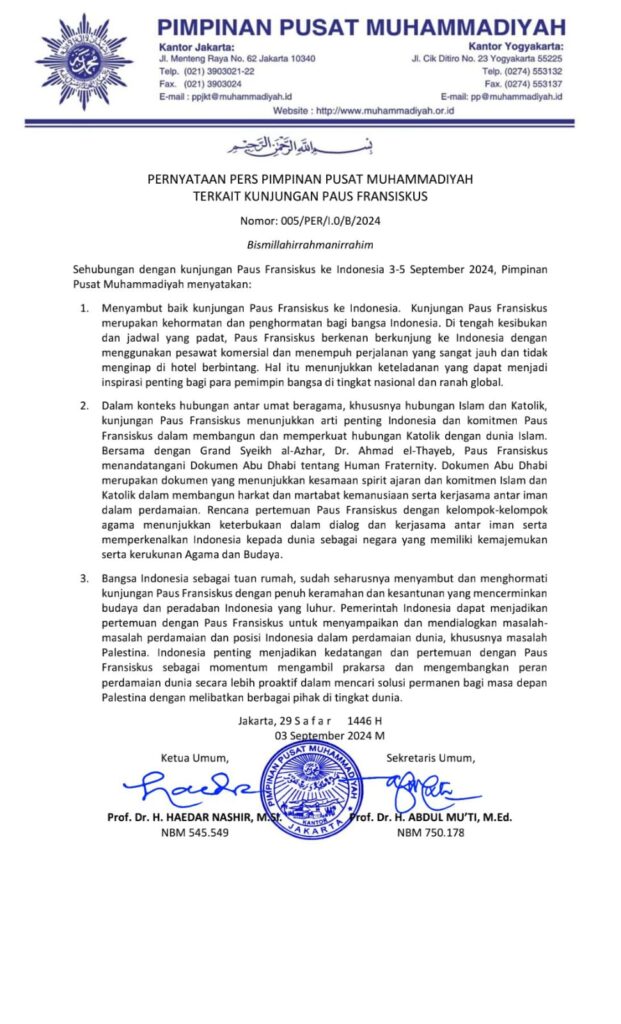 Berikut isi Pernyataan Pers PP Muhammadiyah Terkait Kunjungan Paus Fransiskus: