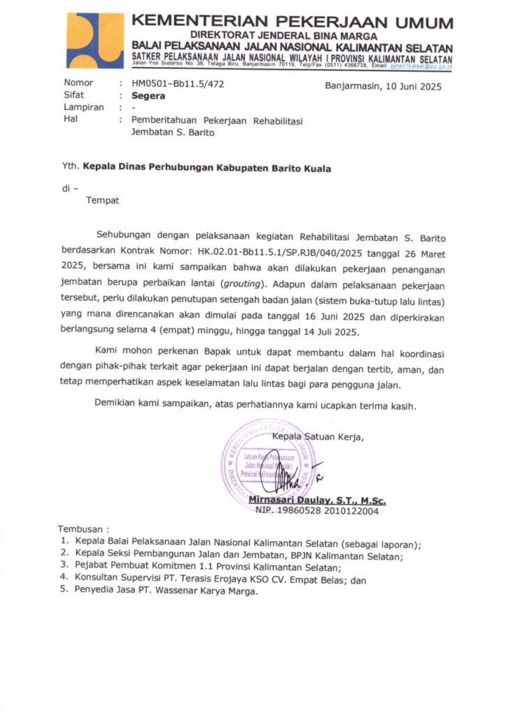 Surat Pemberitahuan Pekerjaan Rehabilitasi Jembatan Sungai Barito. [Foto: WA Group]