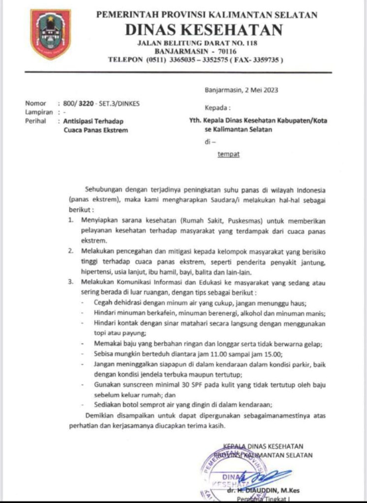 Menanggapi cuaca panas ekstrem ini, Dinas Kesehatan (Dinkes) Provinsi Kalimantan Selatan (Kalsel) menerbitkan surat nomor 800/3220 – SET.3/DINKES pada Senin (02/5), perihal antisipasi terhadap cuaca panas ekstrem.