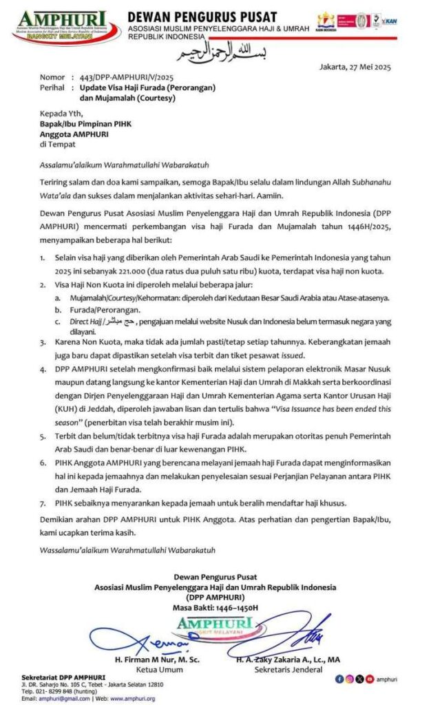 Menyikapi hal tersebut, beredar pula surat dari DPP Asosiasi Muslim Penyelenggara Haji & Umrah RI (Amphuri) tanggal 27 Mei 2025 yang ditujukan kepada pimpinan PIHK anggota Amphuri di seluruh Indonesia mengenai kabar terkini (update) visa Furoda dan Mujamalah.