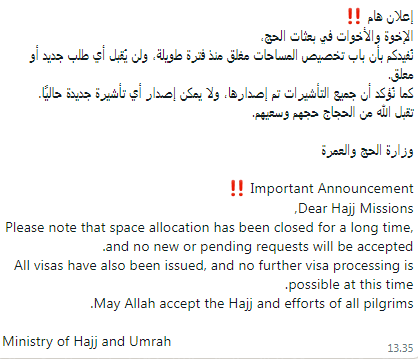 “Harap dicatat bahwa alokasi tempat telah ditutup untuk waktu yang lama, dan tidak ada permintaan baru atau yang tertunda yang akan diterima. Semua visa juga telah dikeluarkan, dan tidak ada pemrosesan visa lebih lanjut yang memungkinkan saat ini,” demikian isi pernyataan resmi yang dikeluarkan oleh Kementerian Haji dan Umrah Arab Saudi, baru-baru ini.