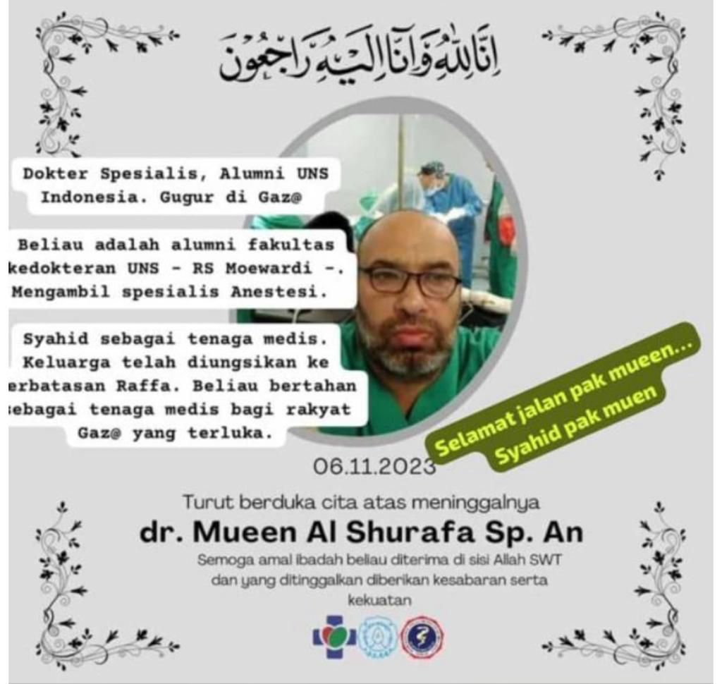 Pimpinan UNS pun mengucapkan bela sungkawa atas wafatnya dr Mueen. “Pimpinan dan Segenap Keluarga Besar Universitas Sebelas Maret turut berduka cita atas wafatnya: dr. Mueen Al Shurafa, Dokter Spesialis Anestesi di Palestina, Alumnus Pendidikan Dokter Spesialis Anestesi Tahun 2018 Fakultas Kedokteran UNS,” tulis UNS melalui akun X resmi (@11MaretUniv).