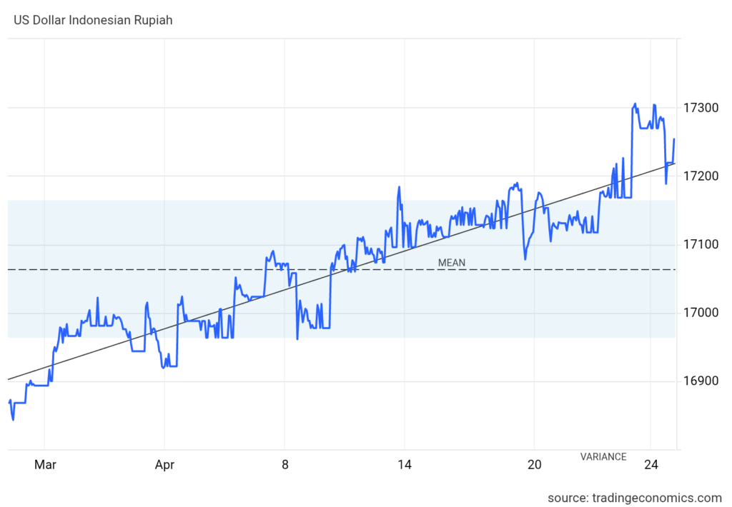 Berdasarkan data Trading Economics yang dipantau mu4.co.id, pada Jum’at (24/4), rupiah sempat berada di kisaran Rp17.200 per dolar AS sebelum kembali melemah ke sekitar Rp17.300.