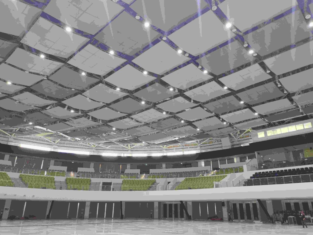 Setelah melangkah masuk ke ruang induk Edutorium semakin terasa kemegahannya. Di lantai 2 disediakan kursi-kursi penonton berwarna hijau muda beratapkan langit-langit yang unik seakan deretan kain yang bersusun.