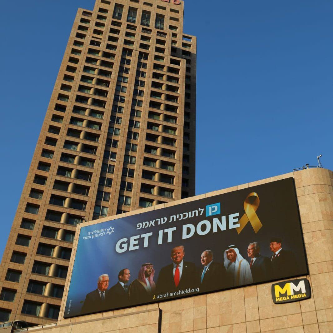 Dalam baliho tersebut, Prabowo tampak berdiri bersama Presiden Trump, Perdana Menteri Israel Benjamin Netanyahu, para pemimpin Arab moderat, serta Ketua Otoritas Palestina Mahmoud Abbas, dengan tulisan berbunyi: “Yes to Trump’s Plan – GET IT DONE”. Di baliho lainnya bertuliskan Mr. President, Israel stands by your plan. Seal the Deal”.