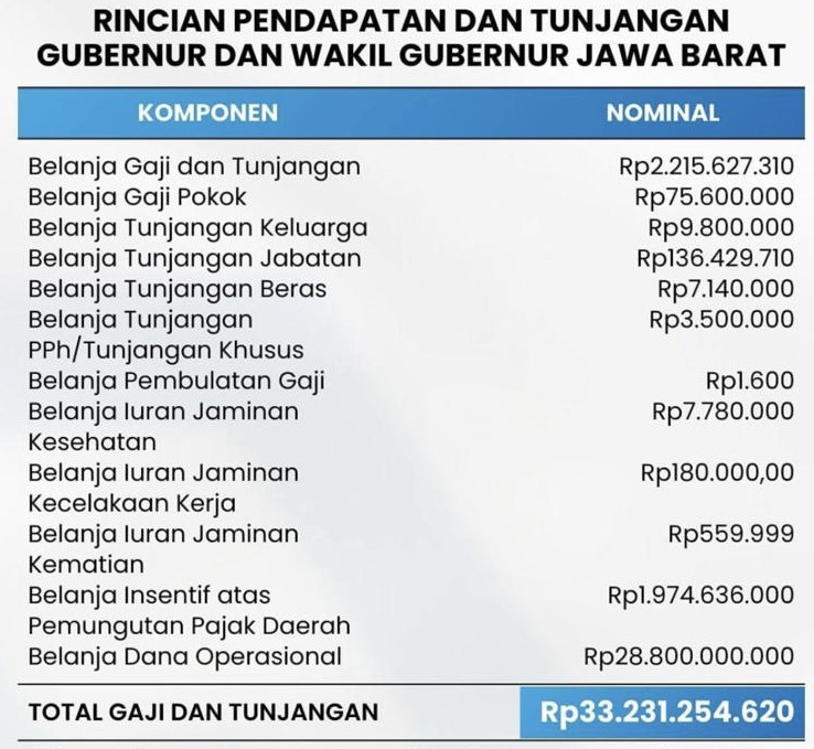 Rinciannya, Gubernur Jawa Barat mendapat Rp. 14,044 M pertahun atau sekitar Rp. 1,2 M perbulan, lalu Wagub Rp. 9,7 M pertahun atau Rp. 800 juta perbulan dan Sekda Jabar Rp. 9,035 M pertahun atau Rp. 753 Juta perbulan.