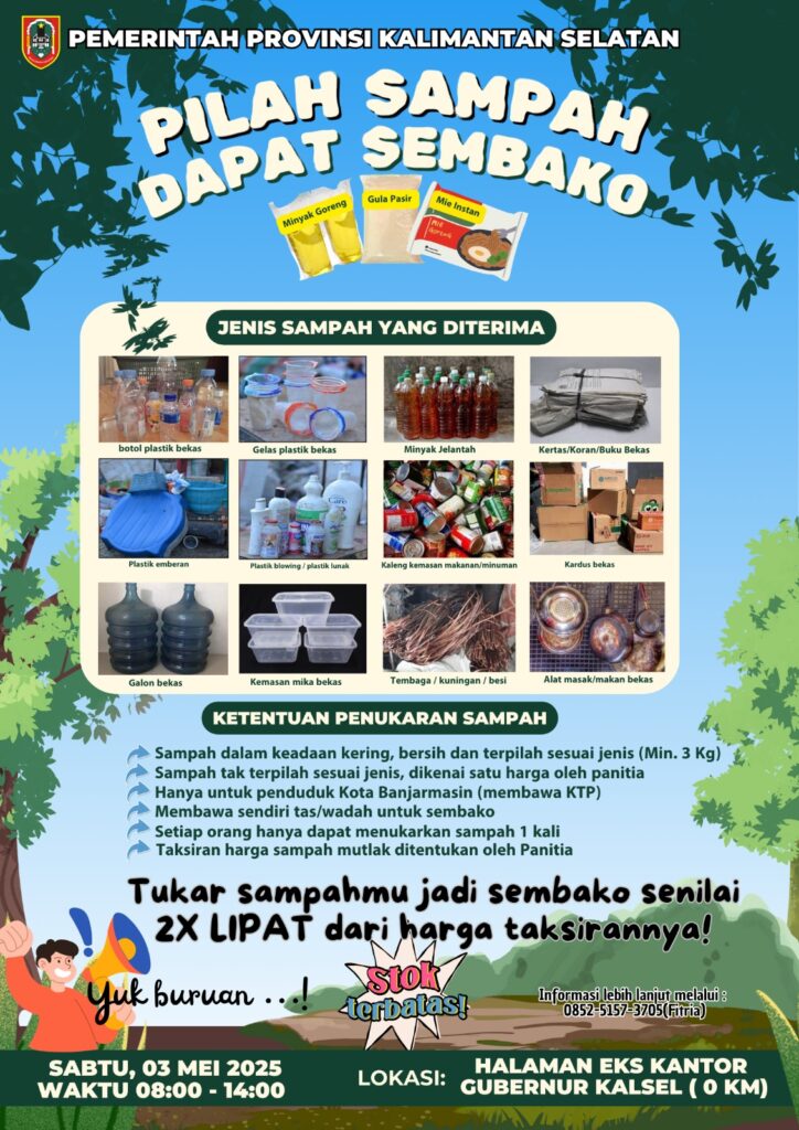 Banjarmasin, mu4.co.id – Sebagai salah satu upaya pemerintah dalam mengatasi darurat sampah di Banjarmasin, Pemerintah Provinsi Kalimantan Selatan akan mengadakan kegiatan “Pilah Sampah Dapat Sembako” pada Sabtu, 3 Mei 2025.
