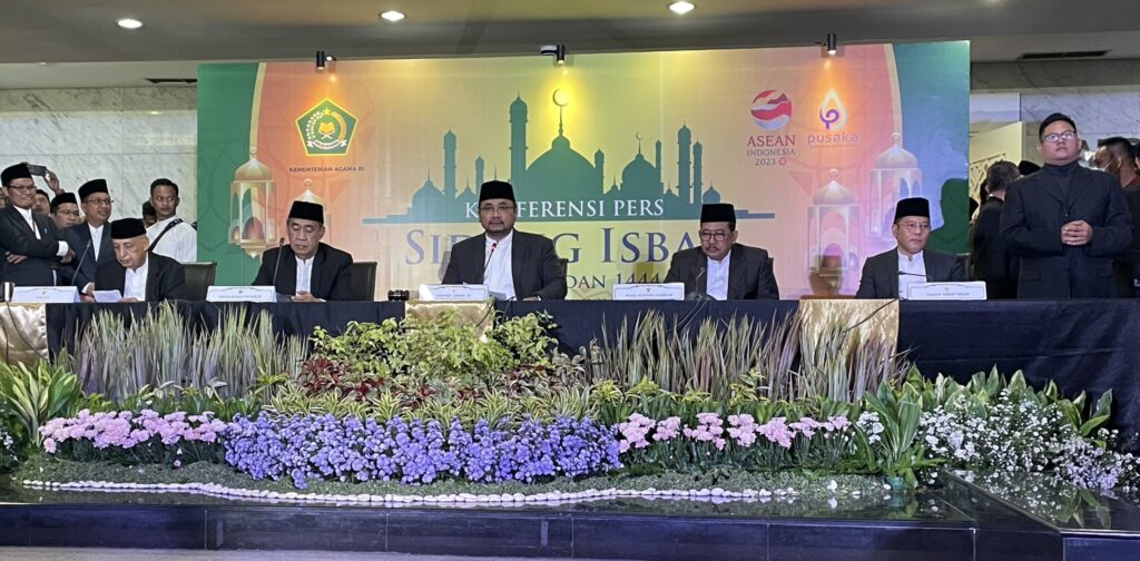 “Berdasarkan hisab posisi hilal seluruh Indonesia sudah di atas ufuk dan telah memenuhi kriteria MABIMS (Menteri Agama Brunei Darussalam, Menteri Agama RI, Menteri Agama Malaysia, dan Menteri Agama Singapura) serta laporan rukyatul hilal, tadi kita bersepakat secara mufakat bahwa 1 Ramadhan 1444 Hijriah jatuh pada hari Kamis, tanggal 23 Maret 2023 Masehi,” ungkap Menteri Agama (Menag), Yaqut Cholil Qoumas saat konferensi pers usai Sidang Isbat.