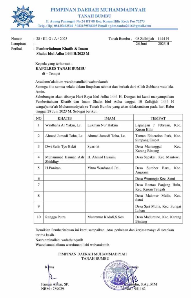 Tanah Bumbu, mu4.co.id – Berdasarkan surat pemberitahuan No.28/III.O/A/2023 yang dikeluarkan Pimpinan Daerah Muhammadiyah (PDM) kabupaten Tanah Bumbu terkait tempat pelaksanaan Salat Idul Adha 1444 Hijriah.