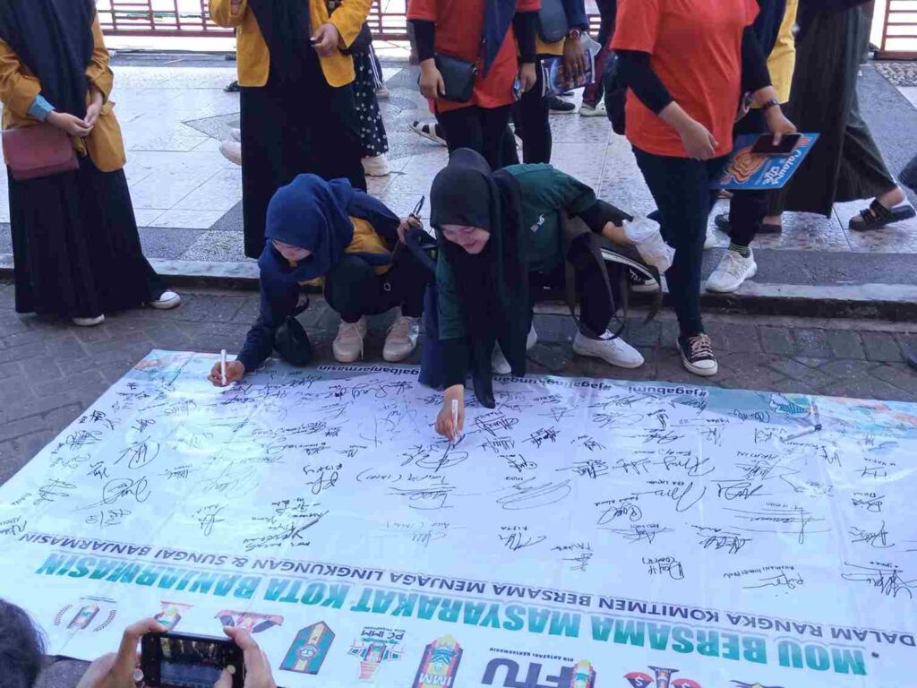 Rekan-rekan aktivis pelajar dan mahasiswa Muhammadiyah kota Banjarmasin menggelar aksi simbolik memperingati hari lingkungan hidup sedunia dengan mengusung konsep penandatanganan MoU bersama masyarakat kota Banjarmasin untuk berkomitmen bersama dalam menjaga lingkungan dan sungai Banjarmasin pada Ahad (11/6/2023) di Siring Piere Tendean.
