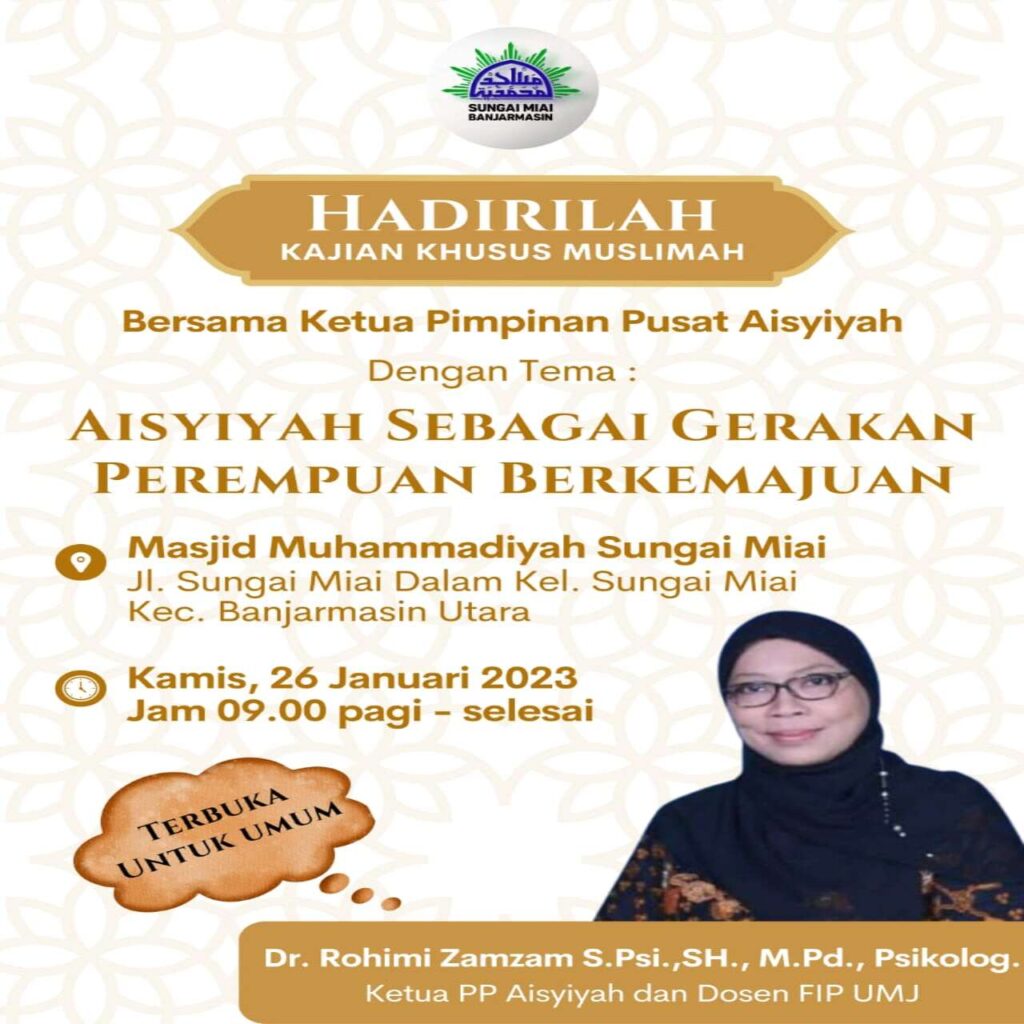Kajian yang insyaa Allah akan dilaksanakan pada Kamis, 26 Januari 2023 pukul 9.00 WITA tersebut selain sebagai ajang silaturrahim ketua PP ‘Aisyiyah dengan ibu-ibu ‘Aisyiyah dan Nasyiyatul ‘Aisyiyah di Banjarmasin, juga sebagai reuni Rohimi mengenang masa remajanya.