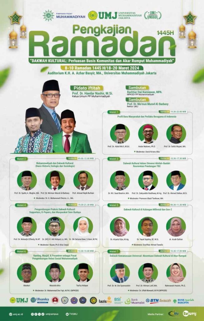 Jakarta, mu4.co.id – Pimpinan Pusat (PP) Muhammadiyah bersama Universitas Muhammadiyah Jakarta (UMJ) menggelar Agenda Tahunan: Pengkajian Ramadan 1445 Hijriah selama 3 hari dari 18-20 Maret 2024 atau bertepatan 8-10 Ramadan 1445 H.