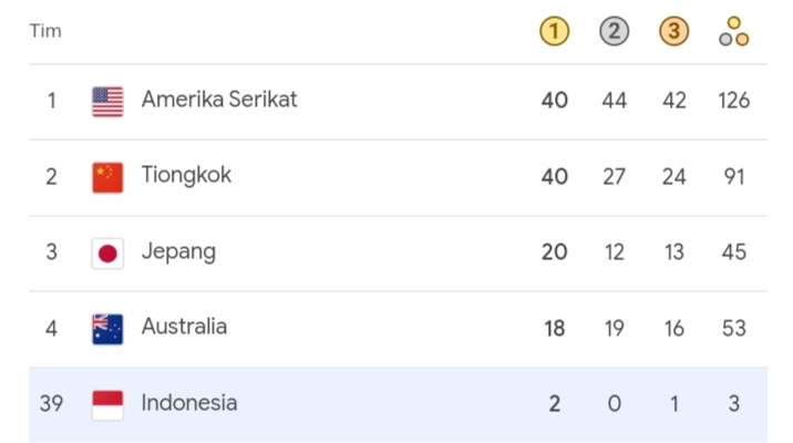Sebagai informasi, posisi Indonesia juga sama dengan Aljazair, yaitu dengan torehan 2 medali emas dan 1 medali perunggu, yang berada di atas Israel (posisi 41), Polandia (42), Kazakhstan (43), dan Jamaika (44). Adapun juara umum Olimpiade 2024 berhasil diraih oleh Amerika Serikat, setelah bersaing sengit dengan China, dengan perolehan 40 emas 44 perak 42 perunggu.