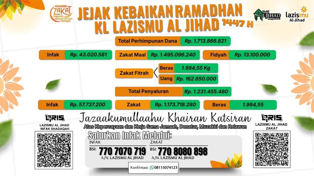“Alhamdulillah, penghimpunan zakat pada Ramadan ini di Masjid Al Jihad dikelola sepenuhnya oleh Lazismu Al Jihad, dengan dukungan dari berbagai unsur di lingkungan Pimpinan Cabang Muhammadiyah (PCM) Banjarmasin 4,” ungkapnya kepada mu4.co.id, Jumat (20/03/2026).