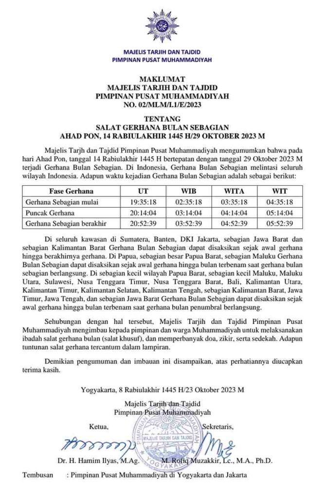 Yogyakarta, mu4.co.id – Majelis Tarjih dan Tajdid Pimpinan Pusat (PP) Muhammadiyah mengeluarkan Maklumat No.02/MLM/I.1/E/2023 tentang pelaksanaan Salat Gerhana Bulan Sebagian yang akan terjadi pada Ahad, 14 Rabiul Akhir 1445 Hijriah atau bertepatan dengan 29 Oktober 2023.