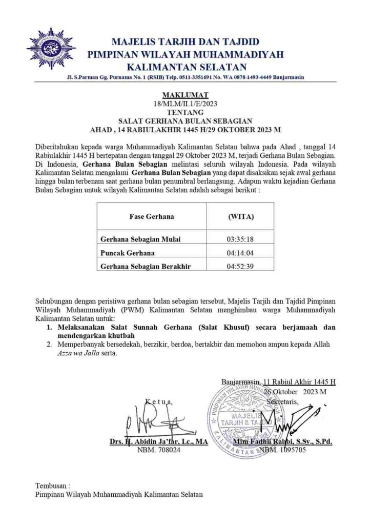 Maklumat tersebut dibuat di Banjarmasin pada Kamis, 26 Oktober 2023 dan ditandatangani oleh Ketua Majelis Tarjih dan Tajdid PWM Kalsel, Drs H Abidin Ja’far, Lc.,M.A. dan Sekretaris Mim Fadhli Rabbi, S.Sy.,S.Pd.