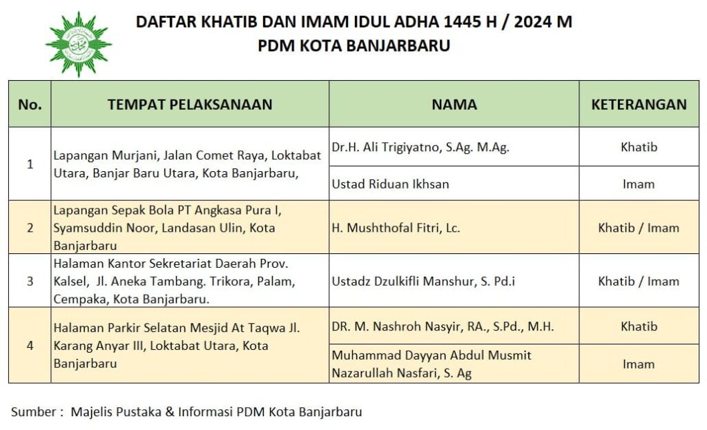 Berikut ini daftar tempat pelaksanaan salat Iduladha 1445 H beserta nama imam dan khatib di kota Banjarbaru yang dikutip dari Majelis Pustaka & Informasi (MPI) PDM Kota Banjarbaru, Jum’at (14/6):