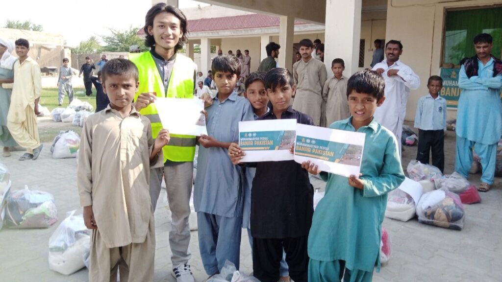 Dalam penyaluran bantuan, tim Muhammadiyah Peduli mengirimkan lima orang personel, yaitu Aji Amin, Zulfikar Audia Pratama, Reza Pahlevi, Arif, dan Fawwas Hamizan. Mereka bertugas untuk terjun langsung mendistribusikan 140 paket logistik dari para donatur yang terdiri dari makanan pokok, sembako, dan 140 paket pakaian yang masih layak pakai ke salah satu titik terdampak banjir. Dalam penyalurannya, tim bekerja sama dengan Masjid Rahmat lil ‘Alamin yang berada di Islamabad.