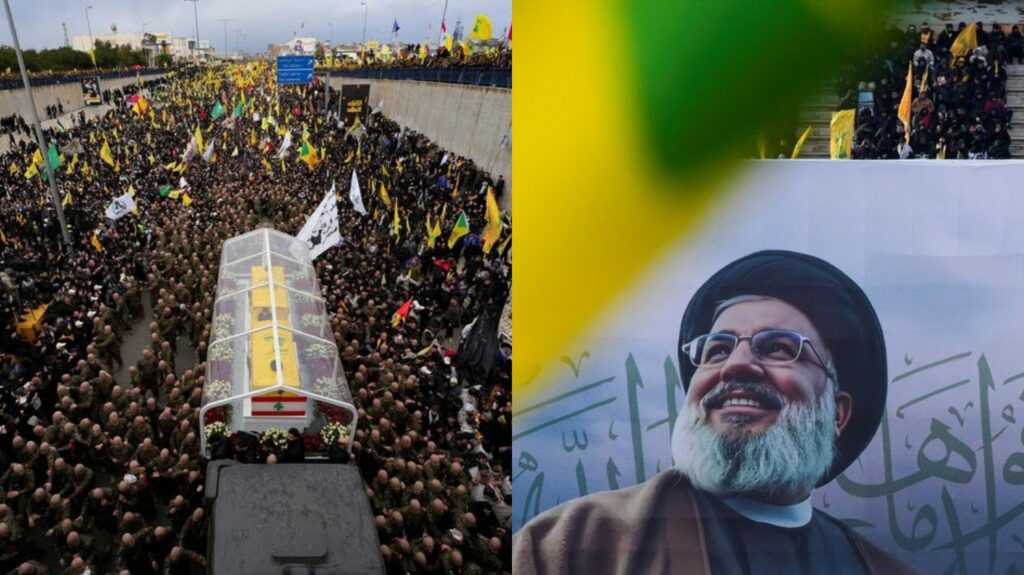 Terlihat puluhan ribu pelayat berpakaian hitam menghadiri pemakaman pemimpin karismatik, beberapa dari mereka bahkan mengibarkan bendera Hizbullah atau membawa foto Hassan Nasrallah ke pemakamannya di sebuah stadion di pinggiran Beirut, Ahad (23/02/2025).