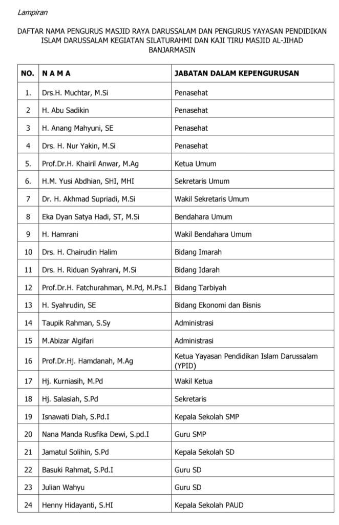 Berikut daftar lengkap pengurus Masjid Raya Darussalam Palangka Raya yang bersilaturrahmi di Masjid Al Jihad Banjarmasin: