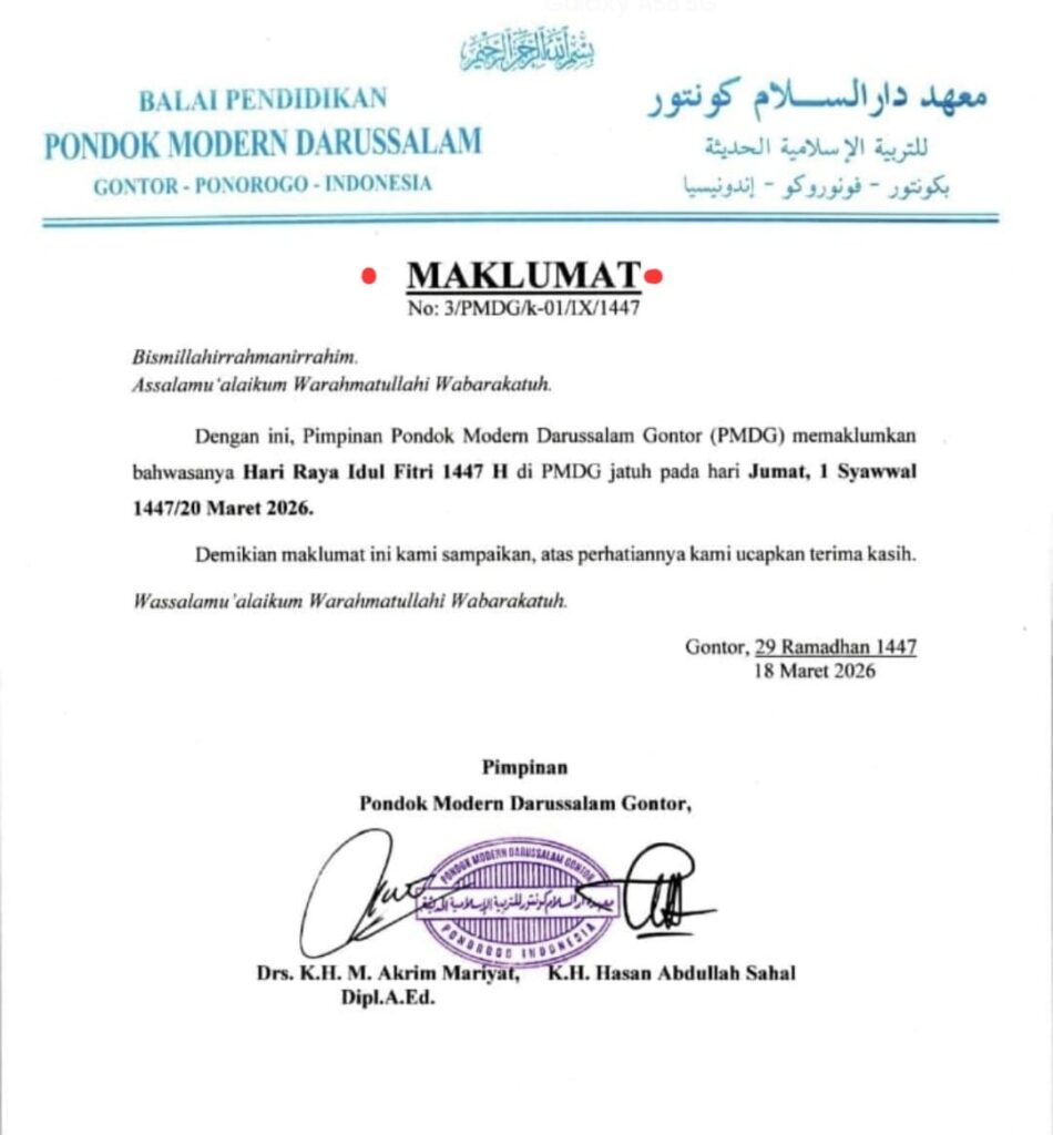 “Dengan ini pimpinan Pondok Modern Darussalam Gontor memaklumkan bahwasanya Hari Raya Idulfitri 1447 H jatuh pada Jumat, 1 Syawal 1447 H atau 20 Maret 2026,” demikian bunyi pernyataan resmi tersebut.