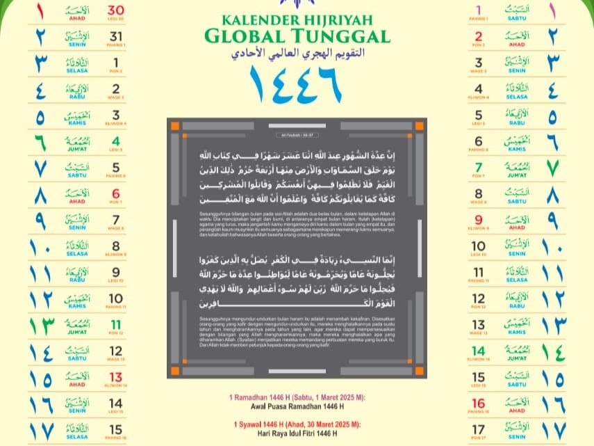 Muhammadiyah telah menetapkan 1 Ramadhan 1446 H jatuh pada hari Sabtu, 1 Maret 2025 sesuai dengan Kalender Hijriah Global Tunggal (KHGT). Sedangkan Hari Raya Idul Fitri 1 Syawal 1446 H jatuh pada hari Ahad, 30 Maret 2025.