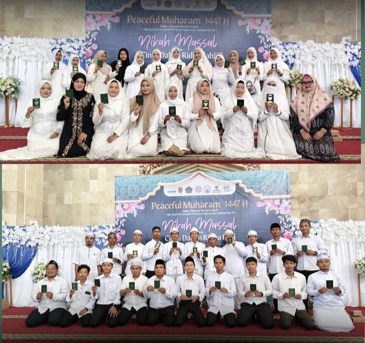 Banjarmasin, mu4.co.id – Sebanyak 325 pasangan mengikuti Nikah Massal serentak se-Kalimantan Selatan, yang diadakan oleh Kantor Wilayah Kementerian Agama Provinsi Kalimantan Selatan sebagai bagian dari kegiatan Muharam Damai 1447 H, di Masjid Raya Sabilal Muhtadin, Banjarmasin, Rabu (23/07/25).