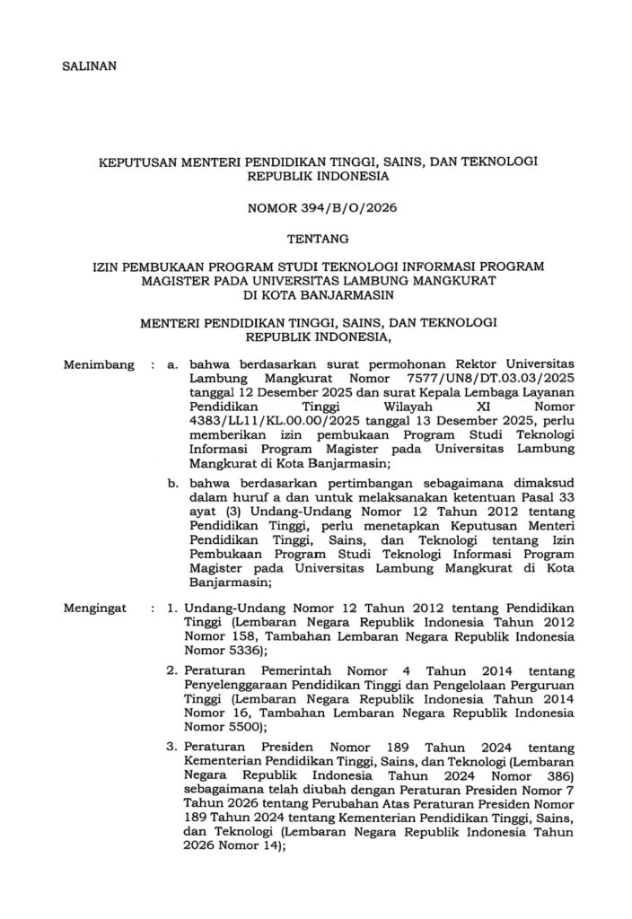 Pembukaan prodi baru ini menindaklanjuti permohonan rektor ULM nomor 7577/UN8/DT.03.03/2025 yang diajukan pada 12 Desember 2025 lalu sehingga Mendiktisaintek menimbang dan memutuskan untuk memberikan izin tersebut karena dianggap telah memenuhi persyaratan minimum akreditasi dan standar nasional pendidikan tinggi.