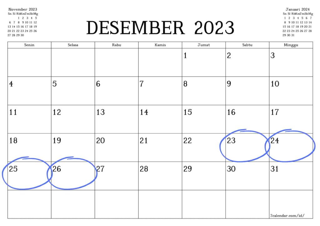 Libur panjang selama empat hari sejak Sabtu sampai Selasa pada 23-26 Desember 2023 [Foto: 7calendar.com, edit: mu4.co.id]