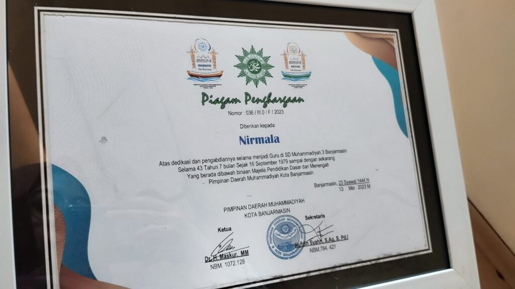 Piagam penghargaan diserahkan saat Musyawarah Daerah (Musyda) ke-13 Muhammadiyah ‘Aisyiyah Kota Banjarmasin, Sabtu (13/5/2023) di Gedung Chandra, Jl. Belitung. Selain Nirmala, ada beberapa guru lain yang juga diberi penghargaan karena telah mengabdi sejak lama.