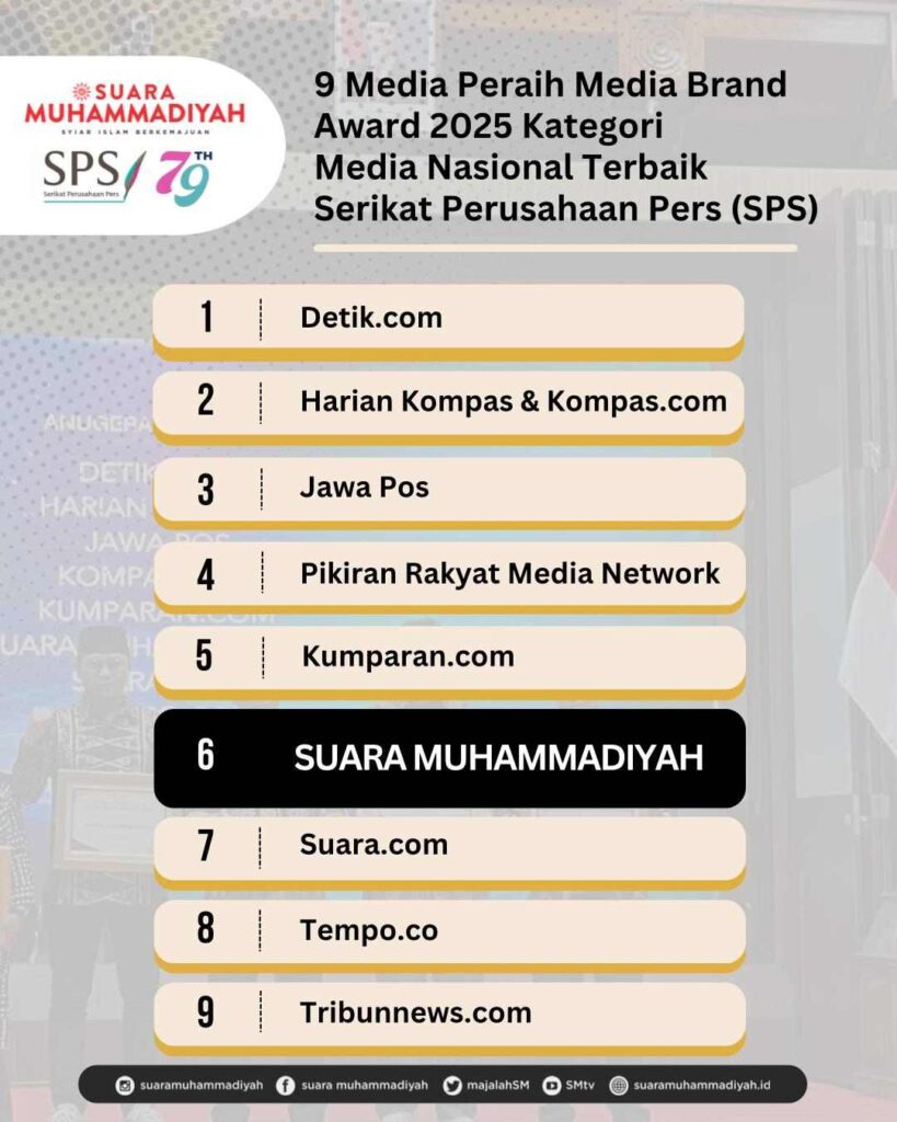 “Suara Muhammadiyah menjadi salah satu dari 8 media nasional papan atas yang terpilih sebagai Media Nasional Terbaik tahun 2025,” ungkapnya.
