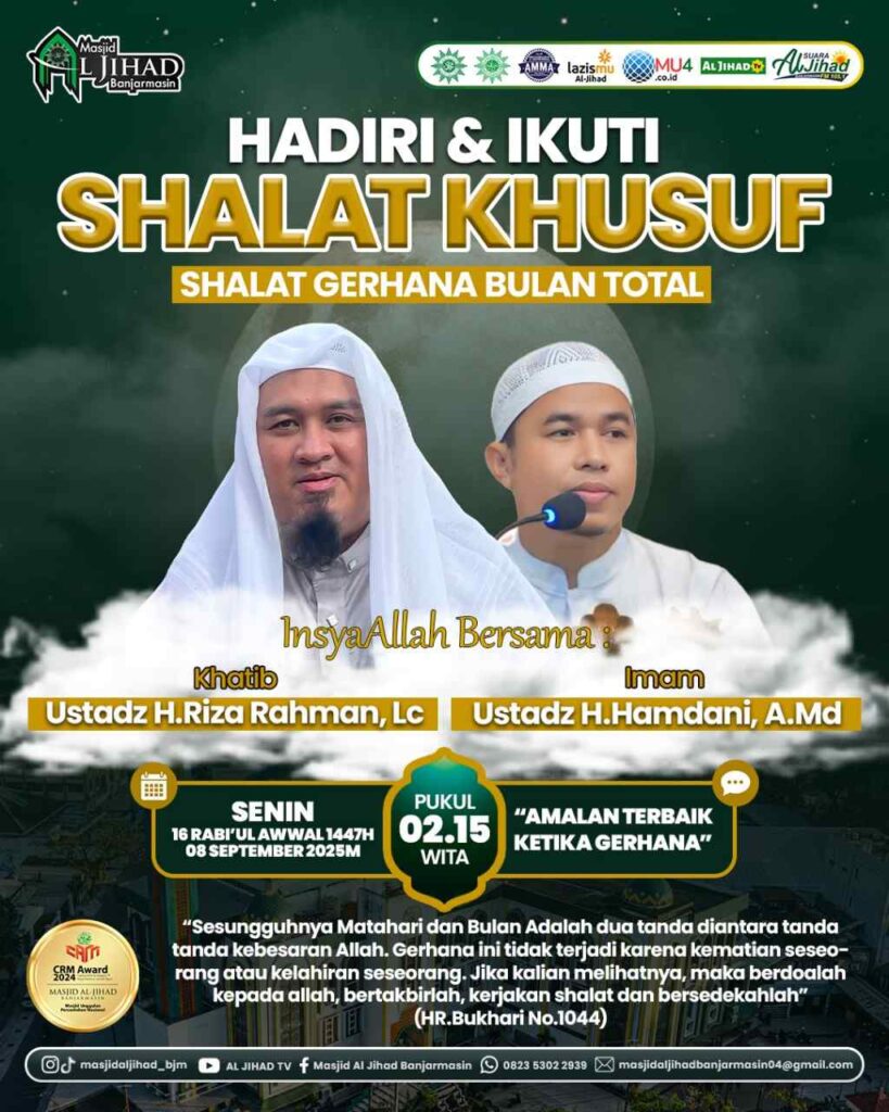Takmir Masjid Al-Jihad Banjarmasin mengajak kepada seluruh kaum Muslimin untuk mengikuti Salat Khusuf pada hari Senin dinihari, 16 Rabiul Awal 1447 H / 8 September 2025 pada pukul 02.15 WITA. Dengan Imam Salat Khusuf yakni Ustaz Hamdani, A.Md., dan Khatib Ustaz H. Riza Rahman, Lc dengan mengangkat tema “Amalan Terbaik Ketika Gerhana.”