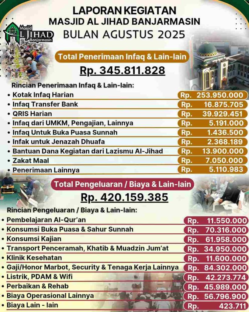 Sedangkan total biaya pengeluaran operasional kegiatan di Masjid Al Jihad Banjarmasin bulan Agustus 2025 sebesar Rp420.159.385, yang mana mengalami penurunan dibandingkan pengeluaran bulan Juli lalu yaitu Rp439.942.531.