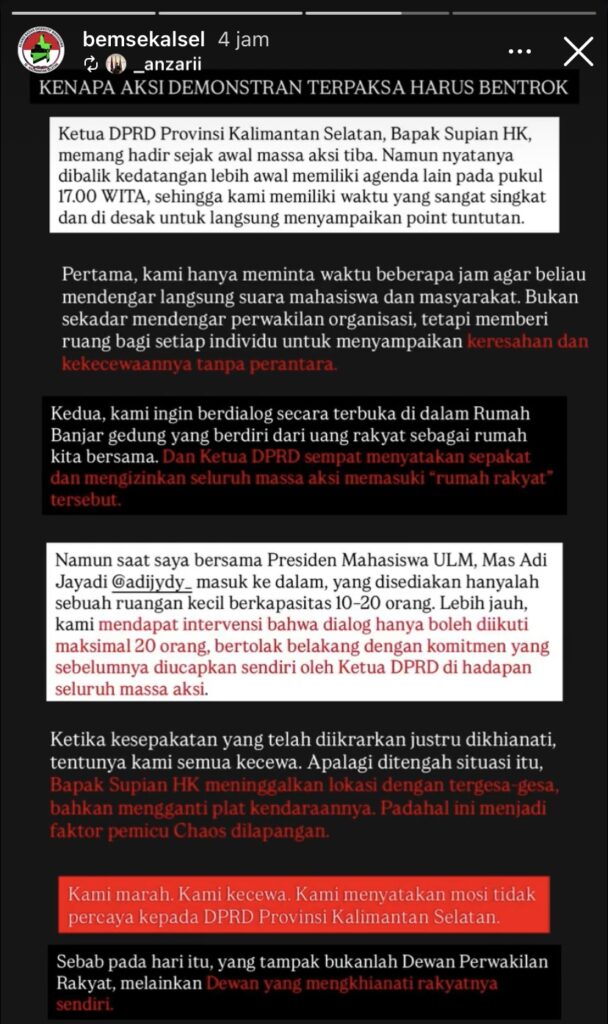 Sebelumnya, Supian sempat menampung aspirasi perwakilan mahasiswa dan mengajak mereka berdiskusi di dalam gedung DPRD hingga pukul 17.00 WITA. Namun, sebelum waktu itu berakhir, ia memilih meninggalkan lokasi.