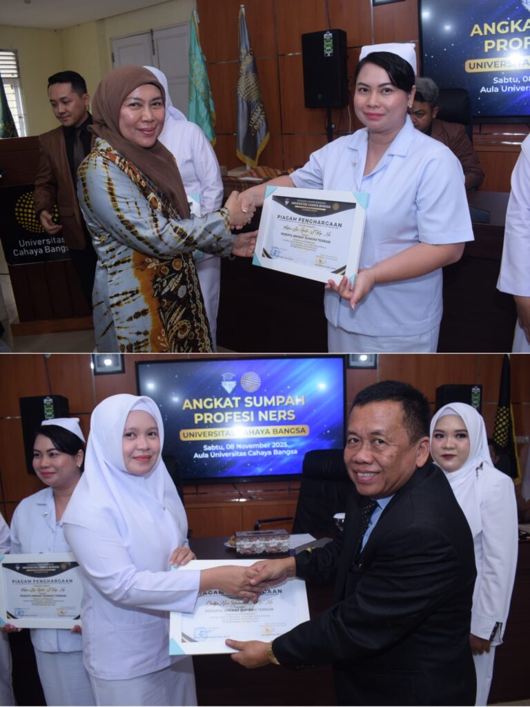 Banjar, mu4.co.id – Universitas Cahaya Bangsa (UCB) melakukan Angkat Sumpah sebanyak 112 mahasiswa Profesi Ners, yang berlangsung di Aula Kampus UCB, Jalan A. Yani Kilometer 17, Kabupaten Banjar, Sabtu (08/11/2025).