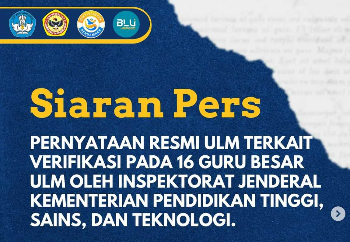 “Itjen Kemendiktisaintek melakukan proses verifikasi terhadap 16 Guru Besar ULM dan surat undangan verifikasi dikirimkan langsung kepada Guru Besar yang bersangkutan. Serta proses verifikasi dilakukan secara tertutup,” sebagaimana isi poin 2 siaran pers tersebut.